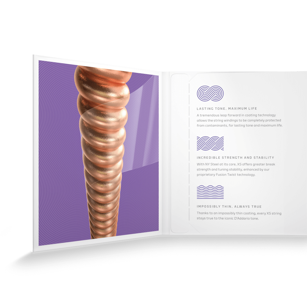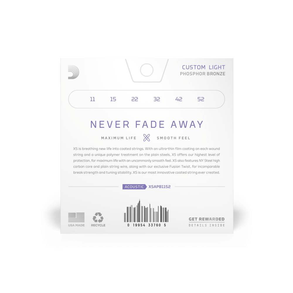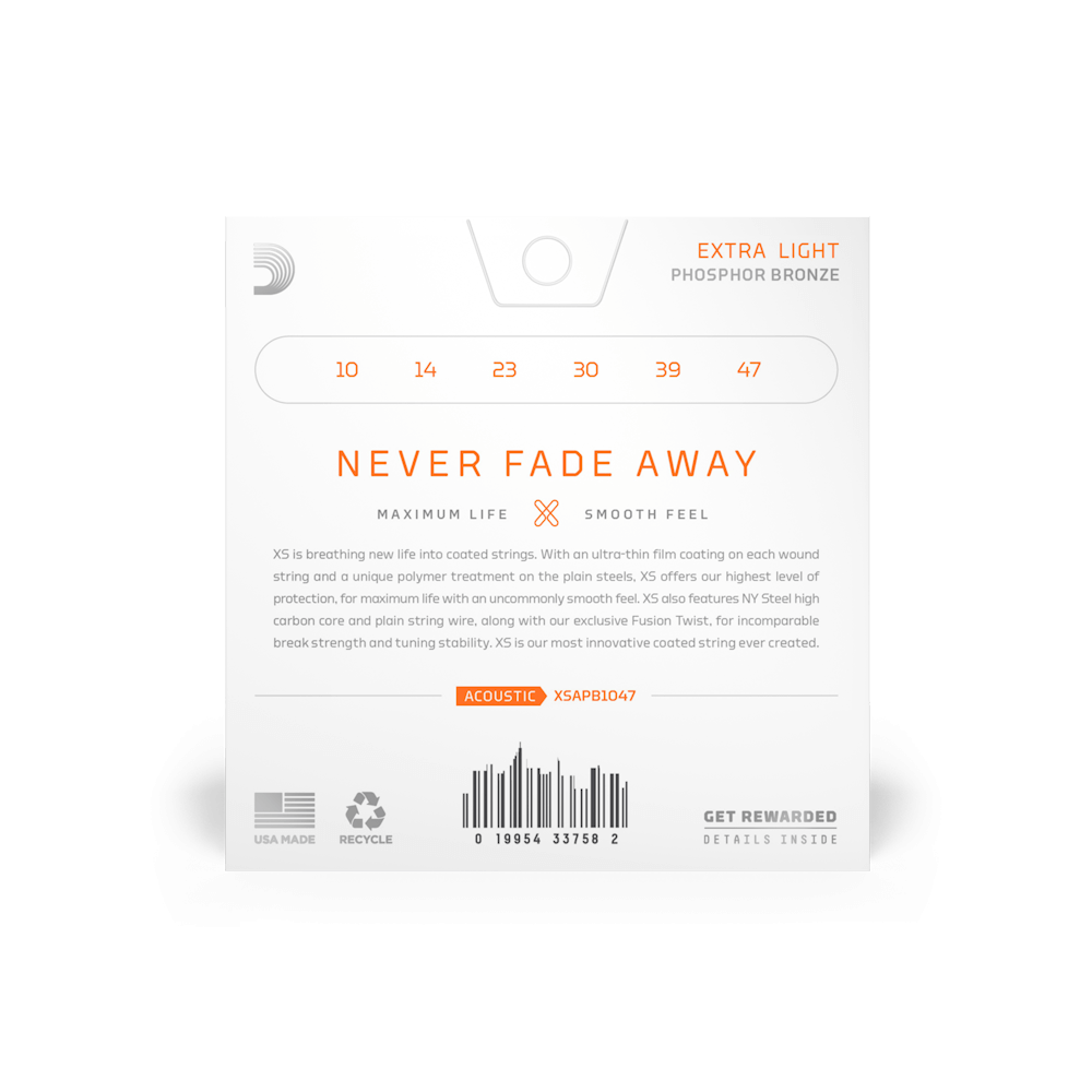 Born from our greatest breakthrough in string innovation, XS Phosphor Bronze strings have the longest life of any D’Addario acoustic guitar string. The XS coating gives our warm, balanced phosphor bronze strings maximum life, with an uncommonly smooth feel. Made with a NY Steel core, phosphor bronze wrap wire and Fusion Twist technology, XS coated acoustic guitar strings have incomparable break strength and tuning stability, in addition to their dramatically increased lifespan.