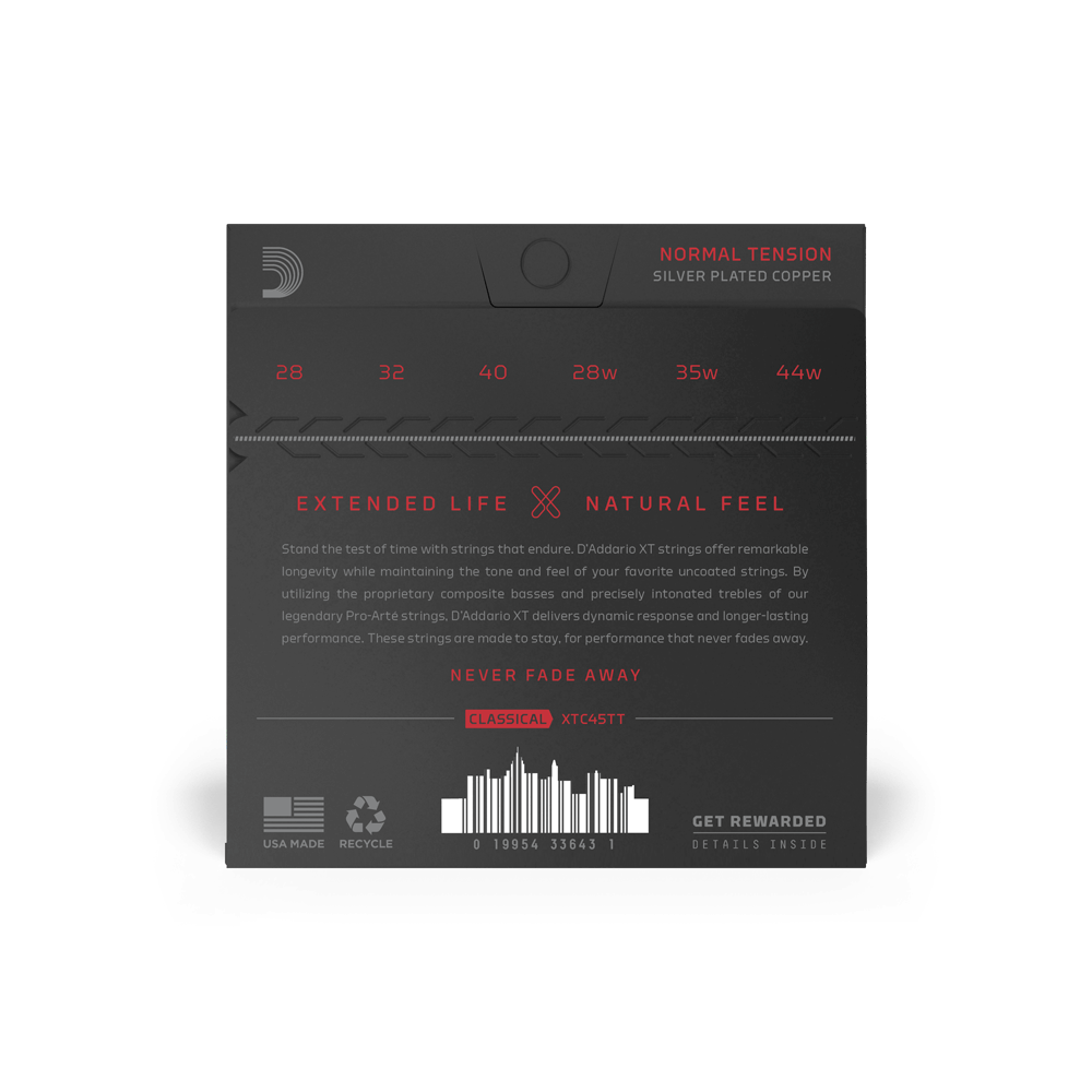 XT are our longest lasting classical strings, combining centuries of D’Addario expertise with modern coating technology. The Dynacore bass strings in this XT set use a revolutionary multi-filament nylon core processing technique to deliver unparalleled intonation, responsive attack, and crystal-clear projection—and with addition of our proprietary XT coating, a significantly extended lifespan. Coupled with our precision Titanium trebles, supplying distinct balance and increased resonance, XT Dynacore is the most advanced classical string available. This Normal Tension set is our best-selling tension, preferred for its balance of rich tone, comfortable feel, and dynamic projection.