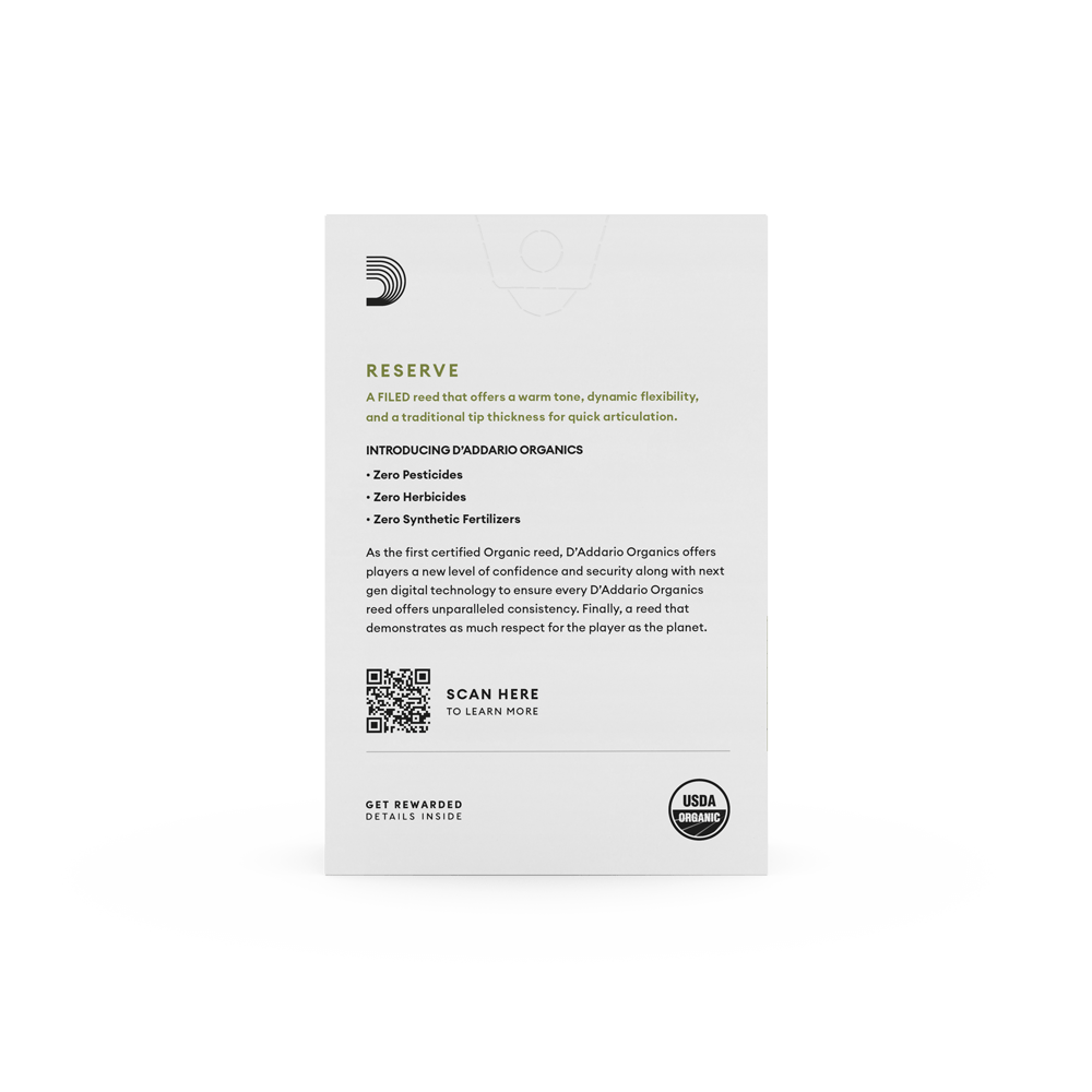 - Organic Reserve reeds provide you with dynamic flexibility and exceptional, warm tone quality when playing due to their long vamp profile. These filed reeds feature a traditional tip to give you an ease of articulation and response. Each reed in the pack comes single-sealed in a recyclable paper reed holder and flow wrap.